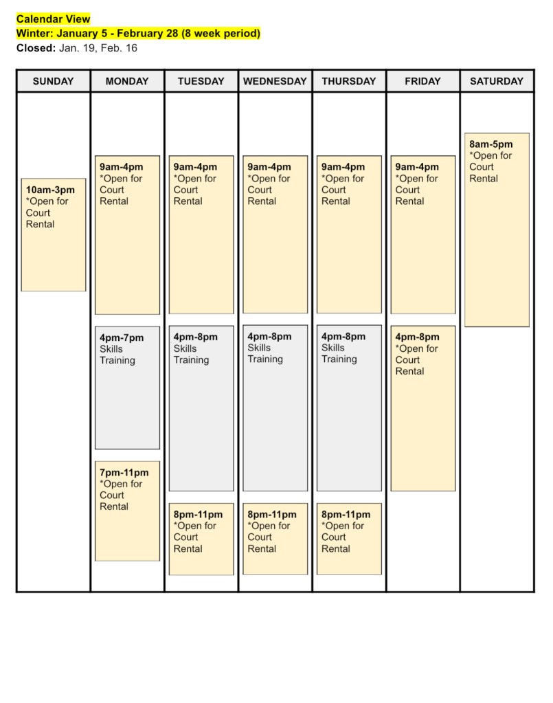 Check the calendar below for availability. Any slots labeled ‘Open for Court Rental’ and ‘TBD’ means you’re welcome to request a session during that time-frame.